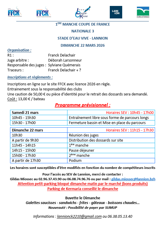 Lannion Canoë Kayak, accueille la Nationale 3, les 21 et 22 mars 2026.
